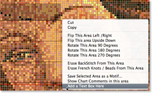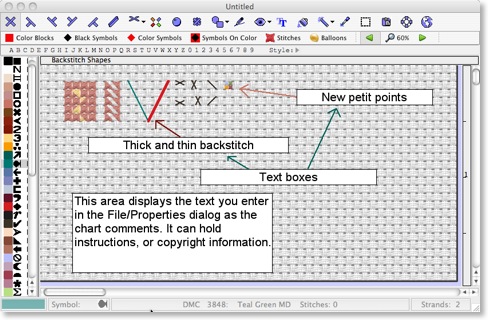 In addition to the existing ‘one line at a time’ and ‘automatic outline’ backstitch, now you can draw freehand and the backstitch will follow the mouse, along gridlines as you draw. This lets you create a shape in backstitch to work within, for example.